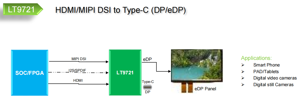 Lontium LT9721是MIPI / HDMI到DP转换器,内置Type-C交替模式开关和PD控制器。